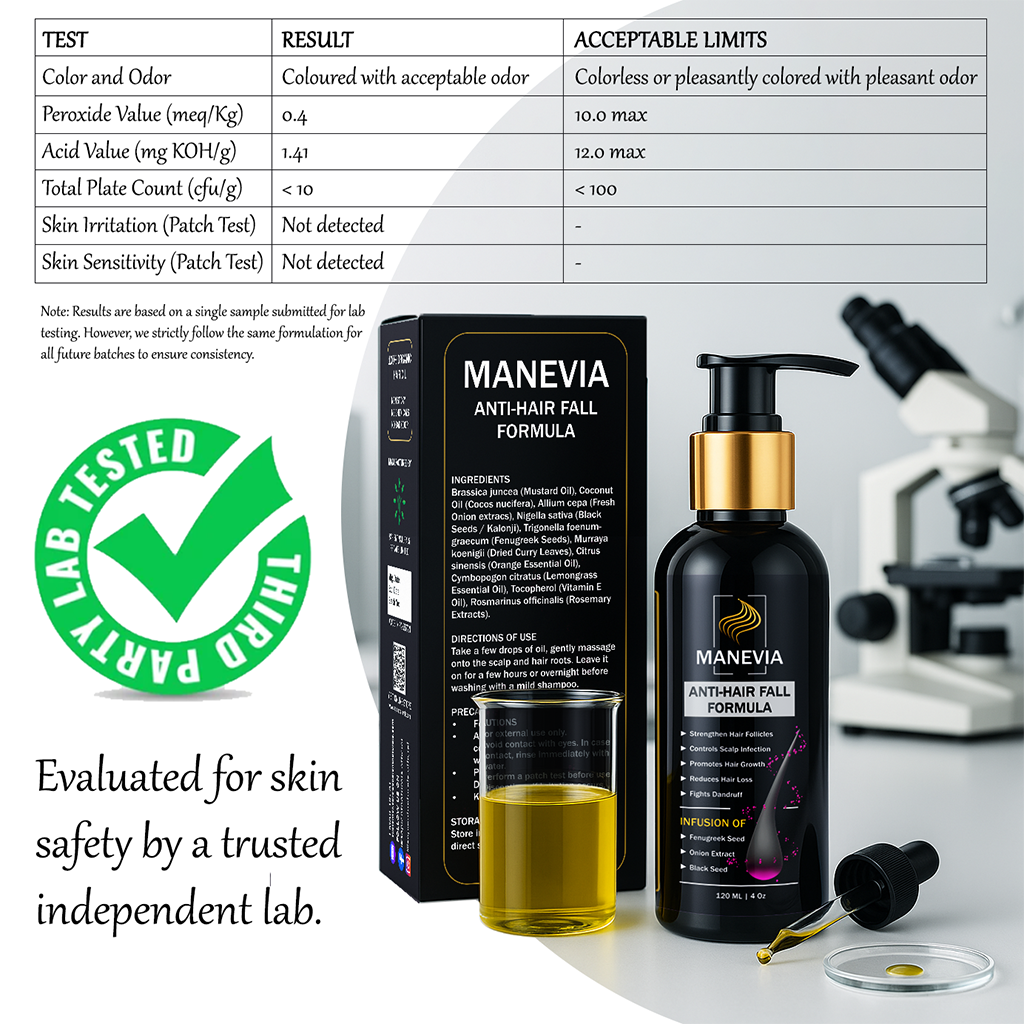A production sample of our MANEVIA Anti-Hair Fall Formula (Hair Oil) was evaluated for skin safety by an accredited independent lab. We maintain strict formulation consistency to deliver the same level of quality in every bottle. Below is a summary of the results from the lab evaluation of the sample batch: